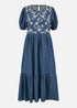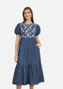 Yumi Blue Chambray Denim Midi Dress With Embroidery & Puff Sleeves