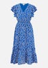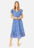Yumi Blue Ditsy Print Midi Dress With Frill Sleeve