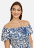 Yumi Blue Ruched Waist Bardot Blossom Tree Print Midi Dress