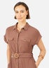Yumi Brown Viscose Linen Look Midi Shirt Dress With Wooden Belt