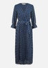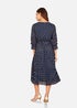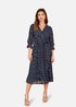 Learn moreEmbellished with starburst in gold foil this Navy midi dress is as pretty as the night sky. With a pleated design, wrap over neckline and self tie belt at the waist this is perfect for day to evening plans. The 3/4 sleeves are finished with a ruffle cuff and add to the overall silhouette of this piece. Add complementing gold accessories to finish off the fit.