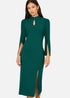A gorgeous pop of colour for any occasion this party season. The midi length hemline has a split in it for a sultry look that is complimented by fluted sleeves. The notched neckline and high collar adds to design elements. Understated glamour is the absolute vibe of this dress.