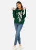 Perfect for layering and easy to match, this fun Green Christmas jumper is covered in a large sequin adorned bow. Knitted and super soft, this piece is perfect for office parties, December activities and festive fun.