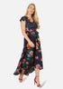 Punchy prints for the summer season, this floral print is gorgeous. In a wrap around shape with frill sleeves and hemline that is floaty and flowy. Incredibly flattering shape with a tie at the waistline that can be worn with heels and a bolero at weddings and invites.