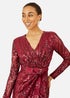 Yumi Red Sequin Midi Wrap Dress With Split Hemline & Long Sleeves