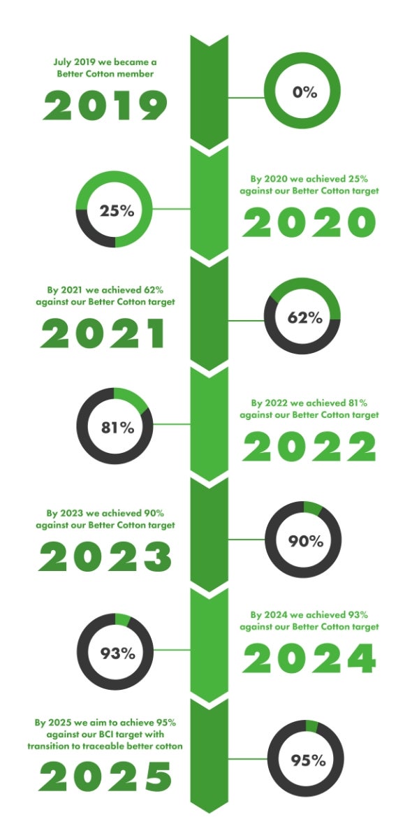 We’re part of Better Cotton to improve cotton farming all over the world. Better Cotton is sourced through a system of mass balance and traceable better cotton. Their Capacity Strengthening Programme helps farmers and farm workers, through necessary tools, training and support, to grow cotton sustainably, while improving their working conditions and standards of living. The programme also helps them to confront inequalities and helps women in the industry become more empowered.