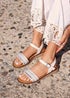 Add a hint of sparkle to your outfit this summer with our Halo embellished sandals. Adorned with an embellished raffia front strap. Indulge in comfort with the moulded footbed and wrap-around ankle strap.
