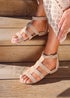 Experience effortless style with our Liberate gladiator sandals. Featuring intertwining straps connecting to a refined ankle strap for a sophisticated and timeless look. Complete with a cushioned insole for all-day comfort and a low block heel.