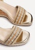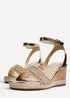 Indulge in luxury with our Ophelia wedge sandals, adorned with a front strap made of shimmering metallic gold raffia and intricate silver embellishments. The 7cm cork platform is surrounded by a woven rope for an elegant touch. Experience ultimate comfort with the cushioned in-sock..