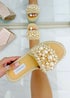Elevate your style with the Lemonade Sparkly Deluxe Pretty Pearl Platform Sliders, where luxury meets comfort in a stunning design.