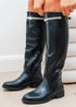 Crafted from sleek black faux leather, these knee-high boots are topped with a shimmering silver trim for a subtle yet striking edge.