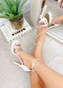 These statement heels feature sleek white faux leather and are adorned with shimmering crystal-encrusted crossover straps that effortlessly catch the light with every step.