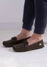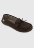 A classic yet casual moccasin slipper in a distressed dark brown fabric. A stylish addition to your indoor winter wardrobe featuring a lace tie detail and a smart herringbone patterned in-sock. Our patented Pillowstep® tufted insole for unique underfoot cushioning plus memory foam, Ultra Comfort foam layers and a durable flexible sole all add up to a very smart slipper choice.