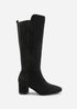 Step into style and sophistication with our Beau Stretch Wide Calf Block Heel Knee High Boots with Side Zip. These fashionable boots are designed to add a touch of glamour to your winter wardrobe.