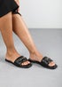 Where's That From Mackenzie Black Sliders With Geometric Metal Strap Detail