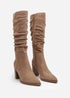 Step into elevated style with these Primrose Slouch Knee High Boots with Block Heel, designed with Ruched detailing and a high block heel for a fashion-forward look. The soft faux suede finish adds a luxurious touch, while the inside zip ensures easy wear. Perfect for pairing with dresses, skirts, or skinny jeans during cooler seasons.