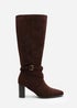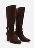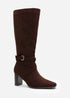 Step into timeless style with our Yvette Knee High Boots With Wrap Buckle Strap featuring elegant strap detailing and a comfortable block heel. Designed to complement both casual and dressy looks, these boots offer structure and sophistication. The soft suede finish and pointed toe add a refined edge, while the side zip ensures an easy fit.