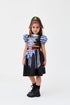 Ahoy there! Set sail on a swashbuckling adventure with our Fearsome Pirate Girl Costume – the perfect outfit for little buccaneers with big imaginations. This eye-catching pirate dress features a bold blue and white striped bodice, glittery gold trim, and puffed sleeves for a classic look with a magical twist. The jagged skirt hem with layered mesh detailing adds movement and sparkle, while the included pirate hat with skull-and-crossbones completes the look. Whether it’s for World Book Day, a themed birthday party, or hours of imaginative play at home, this costume is sure to bring out their inner adventurer. Comfortable, playful, and full of pirate charm – this is dress-up treasure!