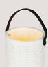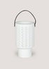 Learn moreInstantly elevate your outdoor living space with this charming ceramic lantern. Styled in white with a contrasting black leather handle, the large-sized lantern features an intricate machine carved texture. This creates interesting beams of light when illuminated with a candle (not included). Variation sizes are also available in the range. Dimensions: 17.5cm x 16.5cm x 29.5cm.