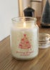 Perfect for gifting or decorating your home, this candle features a delicate pink design adorned with festive bows and a charming Christmas tree motif.