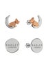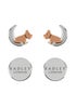Radley Ladies Rose gold and silver plated twin pack earrings. These earrings feature a Rose gold Dog sitting in Silver Moon design and Round Silver Radley Logo design. Includes Radley giftable packaging.