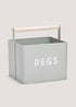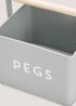 Learn moreA stylish take on a home essential, this handy peg tin is crafted from sturdy grey metal with 'Pegs' inscribed across the front and a cool, contemporary wooden handle for easy carrying. Water escape holes to the bottom help to ensure your laundry pegs don't get soaked on rainy days. Matching accessories are available to complete the look. Dimensions: 19cm x 18cm x 15cm.