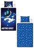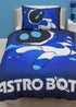 Officially licensed by Sony PlayStation, the top side of the duvet cover features a large print of PlayStation gaming mascot Astrobot on a diffused blue background with the ‘Astrobot’ logo in white. The matching side of the pillowcase features Astrobot relaxing on the same blue background. The reverse side features a repeating pattern of Astrobot in multiple different poses on a blue background, and is matched across one side of the pillowcase.