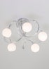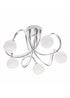 The BHS Soni Flush Ceiling 5 Light features a sleek Chrome finish with curved detailing that adds a touch of modern elegance. Its design includes five opal glass balls, which provide a soft and diffuse illumination. This combination of Chrome and opal glass creates a stylish and contemporary look, making it a perfect choice for enhancing the lighting and ambiance in living rooms, dining areas, or hallways. Height 28cm x Width 46cm. Requires: 5 x G9 bulbs, not included.