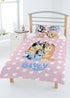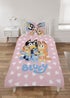 Bring the love and adventure of Bluey into your home with this officially licensed 'I LOVE U' single duvet set. This delightful reversible set showcases the entire Heeler family surrounded by pink hearts, perfect for fans of the lovable character. An essential addition to any Bluey fan's bedroom, this set includes one single duvet cover (137 x 198cm) and one pillowcase (50 x 75cm). Made from 100% cotton, it’s machine washable at 40°C and suitable for tumble drying.