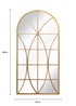 Deliver a taste of regal elegance to your outdoor area with our stunning golden arch mirror. Defined by its unique window design, this statement piece mirror works well for all garden areas to help create the illusion of space. All of our mirrors are beautifully crafted with the upmost care. It also features a water resistant and shatterproof finish for peace of mind. With our wide range of beautifully crafted mirrors you're sure to find one that suits your space perfectly. Please Note: Use wall plugs and screws suitable for outdoor use and the type of wall the mirror will be mounted on. During bad weather and over winter we would recommend it is brought inside for storage. To clean your items, please use mild detergent in warm water. Rinse with clean water and dry thoroughly. Do not use abrasive cleaners, strong detergents, bleach, acid or solvents on the frame parts. Do not use silicone based furniture polish. Features: Wall mounted Arch crowned top Elegant matte gold frame Shatterproof 4mm glass thickness Two hanging points Includes: Keyhole hanger Materials: Metal Glass Dimensions: Product height: 180cm Product width: 90cm Product depth (front to back): 2.5cm Weights: 19.5kg Colours: Gold Additional Info: Wall plugs and screws are not included Keyhole hanger included Suitable for indoor and outdoor use Packaged and secured in protective packaging to prevent damage Move and hang indoors during winter/bad weather