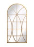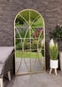 Learn moreDeliver a taste of regal elegance to your outdoor area with our stunning golden arch mirror. Defined by its unique window design, this statement piece mirror works well for all garden areas to help create the illusion of space. All of our mirrors are beautifully crafted with the upmost care. It also features a water resistant and shatterproof finish for peace of mind. With our wide range of beautifully crafted mirrors you're sure to find one that suits your space perfectly. Please Note: Use wall plugs and screws suitable for outdoor use and the type of wall the mirror will be mounted on. During bad weather and over winter we would recommend it is brought inside for storage. To clean your items, please use mild detergent in warm water. Rinse with clean water and dry thoroughly. Do not use abrasive cleaners, strong detergents, bleach, acid or solvents on the frame parts. Do not use silicone based furniture polish. Features: Wall mounted Arch crowned top Elegant matte gold frame Shatterproof 4mm glass thickness Two hanging points Includes: Keyhole hanger Materials: Metal Glass Dimensions: Product height: 180cm Product width: 90cm Product depth (front to back): 2.5cm Weights: 19.5kg Colours: Gold Additional Info: Wall plugs and screws are not included Keyhole hanger included Suitable for indoor and outdoor use Packaged and secured in protective packaging to prevent damage Move and hang indoors during winter/bad weather