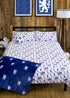 The bedding set features a reversible design, perfect for when you want to freshen up the look of your child’s bedroom. The main front side is inspired by Chelsea’s official colours, with a two-tone striped pattern in blue, with the Chelsea club crest in the centre. The matching pillowcases are blue with the Chelsea lion in the centre. The reverse side of the duvet cover features a harlequin argyle style pattern in blue with the Chelsea lion repeated on a white background, with the pattern repeated on the pillowcases.