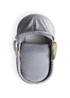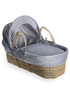 Handwoven from natural palm leaf, this traditional Moses basket by Clair de Lune is lovingly dressed in the UK with plush grey dot dimple fabric to create a soothing and relaxing sleeping area for your baby. The basket itself is made from quality palm leaf and features two handles for portability, together with an adjustable, removable hood to keep the sun away from baby's delicate skin and out of their eyes. The basket comes complete with a firm, fibre mattress fro a safe night's sleep. The dressings included with this Moses basket are removable and machine washable for easy care. Made with love in Great Britain. Dimensions (Base): 75cm x 28cm x 24. Stand sold separately. Safety information Suitable from birth to a maximum weight of 9 kg (or until baby begins to roll over, pull themselves up or sit unaided). We do not recommend that you move the basket while your baby is inside. Conforms to BS EN 1466: 2014.