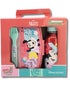 A set of four items includes an aluminum bottle, a spacious sandwich box, a plastic fork, and a spoon, perfect for kids' snacks or lunch on the go. Adorned with vibrant Minnie Mouse graphics.