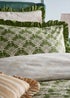 Transform your bedroom into a tranquil haven with the Deco Palm Printed Ruffle Duvet Cover Set. Featuring an elevated design inspired by the glamour of mid-century Palm Springs, its hand-drawn fan palm print creates a stunning geometric pattern that evokes a serene, tropical escape. The silky polycotton fabric ensures luxurious comfort, while the frilled trim adds an elegant, vintage touch—both practical and stylish. The reversible design offers versatility, allowing you to switch to neutral tones for a more understated aesthetic. Perfect for those who value individuality and sophistication in their home.