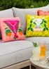Have fun in the sun with the ‘Cosmo O’ Clock’ outdoor cushion from our thirst-quenching collection. Featuring a unique, abstract design of a Cosmo cocktail, surrounded by fresh fruits, and a playful slogan. This cushion is complete with a complementing pink reverse and will be a playful addition to your outdoor setting this summer season.
