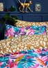 The colourful masterpiece is a tropical delight with vibrant pinks and blues coupled with golden touches. The flip side brings you a leopard in biscuit and caramel tones.