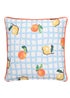 Bring citrus cheer outdoors with the My Darling Clementine cushion from Fusion. Made from 100% cotton with a water-resistant finish, it features a vibrant bowl of clementines on sky blue with zesty orange piping. The reverse reveals a playful blue and white check scattered with lemons and clementines.