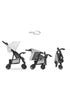 Shopper Neo II is the perfect companion for shopping and travel. It can be unlocked and folded down quickly and compactly with just one hand, leaving the other one free for your child. It skilfully manages buses, trains, and stairs. Its folded dimensions are so compact that the Shopper Neo II can easily be stored in any boot. The buggy's big wheels guarantee pure driving fun, while it winds its way easily through busy pedestrian areas thanks to its swivelling and lockable front wheels. Keep bottles, refreshments and bits and pieces on the two accessories trays. Store your shopping or baby accessories in the large basket. When your little one is tired, adjust the backrest into a lying position, step by step, with just one hand. The footrest is also multi-adjustable. Keep a constant eye on your child through the ventilated viewing window in the canopy. Thanks to the included raincover, your child is well protected against wind and rain. Your little one will always be safe on the move thanks to the padded 5-point harness and the front bumper. The parking brake reliably prevents the buggy from moving while you take a break. You can use Shopper Neo II for a long period of time as it carries up to 25 kg (seat unit 22 kg + basket 3 kg). This means we are voluntarily satisfying requirements over and above legal standards.