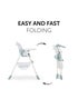 COMPACT AND COMFORTABLE SPACE-SAVER The Sit N Fold is a comfy toddler highchair with flat folding that will accompany you wherever you go. No matter if to grandma’s small kitchen, a narrow dining area or on your balcony – the foldable Sit N Fold highchair creates space in no time. Thanks to the removable tray, you can use the highchair freestanding, too, and fold it in a space-saving manner. You need no more than a grip on the lateral buttons and the compact Sit N Fold can be easily carried to the next room or niche. The practical Sit N Fold can be individually adapted: the tray can be adjusted in three positions, offering optimal space for your growing child. For cleaning, the tray can be removed and hung up on the highchair’s back until you need it again. The high backrest is softly padded and can be inclined to a resting position with one hand, always offering your little one well-being. Also, the integrated 5-point harness and anti-slip protection help keep your child safe. In the extra-large storage basket under the seat, you will have everything important right at hand, from wet wipes to toys. Very smart design: this toddler highchair with table makes your day-to-day life a lot easier. The table is easy to clean and can be removed, too, should something be spilled despite the elevated edge and cup molding. Thanks to its large dimensions, the tray can be used not only for meals, but also for drawing, kneading, and playing.