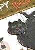 • Includes black cat, pumpkins, skulls, witch hat, and spiderweb accents