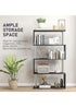 Learn moreTired of the same old look? Break away from the norm with the unique and contemporary style of this S-shape bookcase from HOMCOM. Five shelves of storage make it easy to display your favorite books, photos, collectables and more. Best of all, thanks to an open-back design, it doubles as a bookshelf and room divider. Item Name: S-Shape Bookcase Colour: Black Material: Particle Board, Metal Overall Dimension: 80L x 30W x 145Hcm Each Tier Height: 34cm Weight Capacity: 25kg Custom label: 02-0600