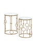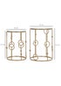 A striking frame design, paired with the luxe golden colour, makes these two side tables a glamorous addition to your home. The frames, made from metal, are crafted into a cool hoop and ball design, covered in water-resistant paint for extra protection. The table tops are made from safe tempered glass to offer a solid and sleek resting place. Set comes with one big table and one smaller, allowing you to neatly tuck the latter into the larger one for excellent space saving. Color: Gold Material: Metal, Tempered Glass Big Table Size: 41 x 57H cm Small Table Size: 36 x 51H cm Tempered Glass Thickness: 5mm Weight Capacity: 30kg Item Label: 833-674