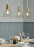 Elevate your dining experience with the INLIGHT BRECKEN 3-Light Diner Pendant, a perfect blend of timeless elegance and modern design. Featuring three domed clear glass shades paired with brass detailing, this striking pendant casts a beautiful, ambient glow, making it the perfect centerpiece for your dining area. Whether you're hosting a dinner party or enjoying a quiet meal, the BRECKEN Pendant creates a sophisticated atmosphere in any space. Requires 3 x E27 ES bulbs, not included. ADJUSTABLE Height 40-110cm x Width 90cm.