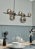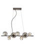 Make a dramatic statement in your dining space with the INLIGHT ORBIE 7-Light Diner Pendant. Featuring seven metallic smoked glass shades suspended from a sleek black chrome frame, this pendant light brings both elegance and bold style to any room. The combination of metallic tones and soft, diffused light creates a captivating ambiance, making it the perfect focal point for dining rooms, kitchens, or modern living areas. Requires 7 x G9 bulbs, not included. ADJUSTABLE Height 45-115cm x Width 75cm.