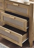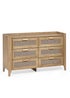 A beautifully sleek design with a bohemian feel, the Sydney 6 Drawer Wide Chest offers exquisitely curved edging accompanied by a raised lip around the edge providing a practical addition, stunningly combined with a rattan-effect sticker front. Finished with a natural oak effect featuring six wide drawers providing the ideal storage space for any bedding or clothing items plus extra space on top for ornaments to be placed. Creating the perfect airy, warm feel within your home.