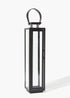 Brighten up your living space with this cool, contemporary lantern. The perfect place for a pillar candle, the lantern features a slender black metal frame, a carry handle to the top, and glass panels to the sides for the inner light to shine through. Perfect for creating a warm, welcoming atmosphere for evenings spent round the table with family and friends. Dimensions: 13cm x 12cm x 53cm.