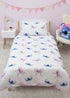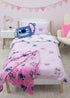 Packed with chaotic energy and adorable charm, Disney’s Lilo & Stitch are impossible not to love. This officially licensed Lilo & Stitch bedding set is designed for single beds and includes a reversible duvet cover and pillowcase to easily freshen up the look of your child’s bedroom. The front side of the duvet cover features a repeating pattern of Stitch and Angel from Lilo & Stitch with string stripes and hearts on a lilac background that runs on to one side of the pillowcase. The reverse side features a repeating pattern of Stitch and Angel with love hearts on a white background that runs on to the pillowcase. The bedding and pillowcase have a pink piping trim around the seams. The bedding is made from recycled polycotton and printed to a high standard. The duvet cover has popper fasteners so it’s easy to remove to wash and remake afterwards. The duvet cover and pillowcase are machine washable, and tumble dryer safe. Designed for single beds, this Disney Lilo & Stitch duvet cover measures 135 x 200cm, and the pillowcase is a standard UK size of 74 x 48cm.