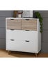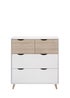 Learn moreThe Stockholm 4 Drawer Chest is part of the smart look of the Stockholm range. Offered at a very attractive price, the chest of drawers is comprised of a matt white finish carcass resting on delicate legs with 4 drawers of varying sizes featuring integral handles. The ever popular oak front detail on 2 drawers coordinates the Chest with the rest of the Stockholm range. Perfect for creating a sleek, retro style, team this piece with the complete bedroom range for a cool and refreshing space. (900x390x820)