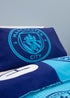 Come on you Citizens! Perfect for any young City fan, this officially licensed Manchester City Football Club bedding set includes a single duvet cover and pillowcase. Featuring a reversible design, perfect for when you want to freshen up the look of your child’s bedroom. Inspired by the team colours, the front side of the duvet features the Man City club badge on bands of light and dark blue with ‘City’ in white, and a matching pillowcase of the Man City crest in light blue on a dark background. The reverse side features a repeating pattern of the Manchester City badge on a diffused blue background. The set includes a single reversible duvet cover, measuring 135 x 200cm, and a pillowcase measuring 74 x 48cm. The duvet cover is closed with poppers, so it’s easy to remove and wash, and is machine washable and tumble dryer safe. The bedding is made a polycotton mix of responsibly sourced cotton and recycled polyester, so not only is your child supporting their favourite team, they’re also helping the environment!